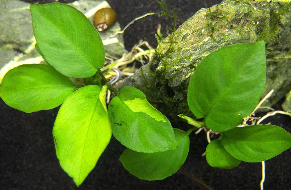 The leaves of Anubias barteri are large, pointed at the ends, and leathery in texture. Because its leaves are tough, they are usually not eaten by fish or other plant-eating critters. This plant is excellent for aquariums that house fish, snails, and dwarf shrimp, as it provides biofilm, hiding places, and security for all aquarium inhabitants.
