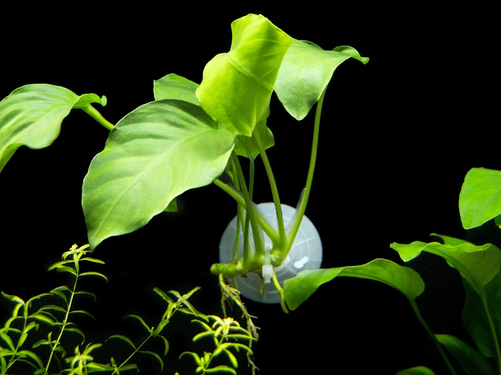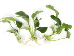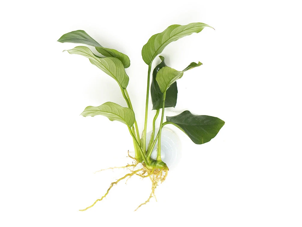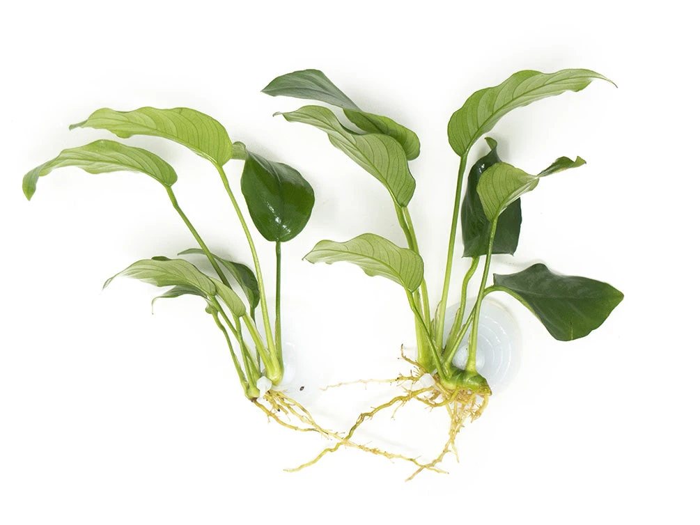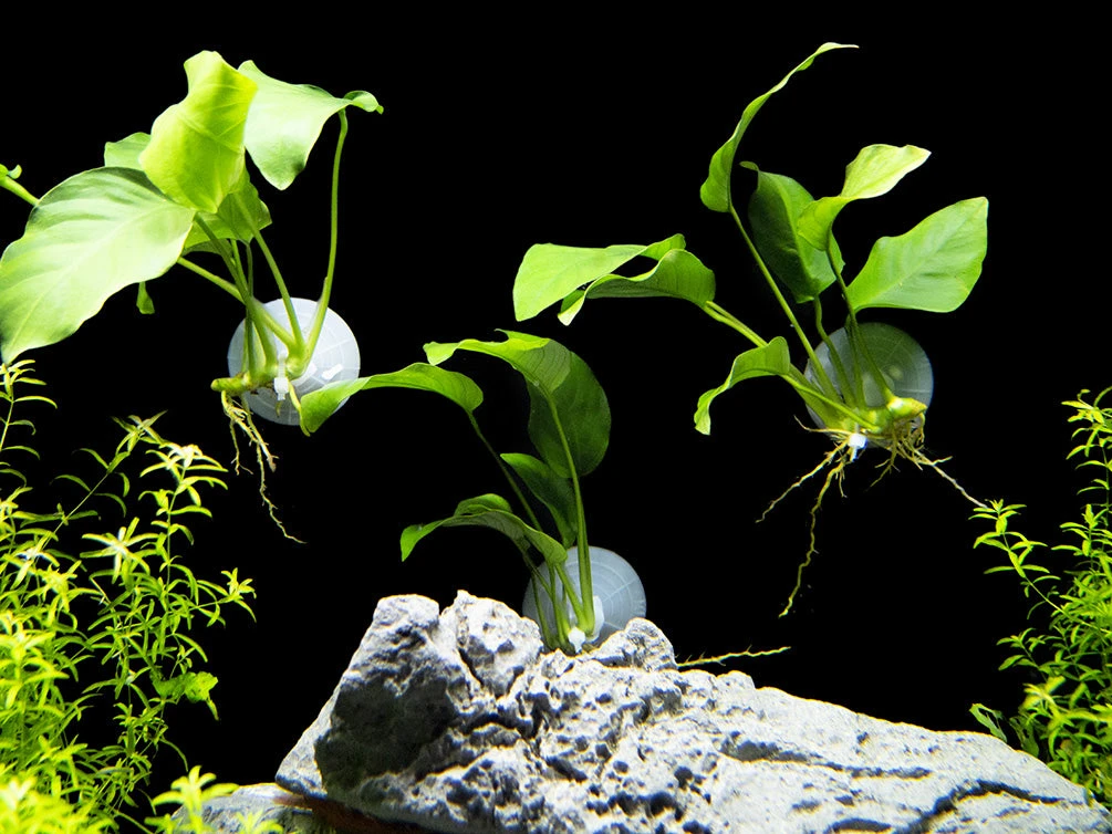 Dwarf Anubias, also known as Anubias nana (or by its full scientific name: Anubias barteri var. nana), is a variation of the popular Anubias barteri plant. Like Anubias barteri, Dwarf Anubias is visually appealing and very easy to maintain; it can be either partially or fully submerged in water. It features large, dark green leaves that look very sleek and give the plant a tropical appearance.