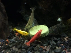 These are the algae wafers that we feed to all of our aquatic critters as a special treat. They go absolutely crazy for these and several animals will crowd around one wafer, eager to get a bite! Fish, shrimp, crayfish, snails… all of them absolutely love this food! This food is particularly ideal for bottom dwellers, since the wafers quickly sink to the bottom of the tank once dropped in. However, other kinds of fish love the wafers as well and will vigorously chase them down once they catch a whiff!