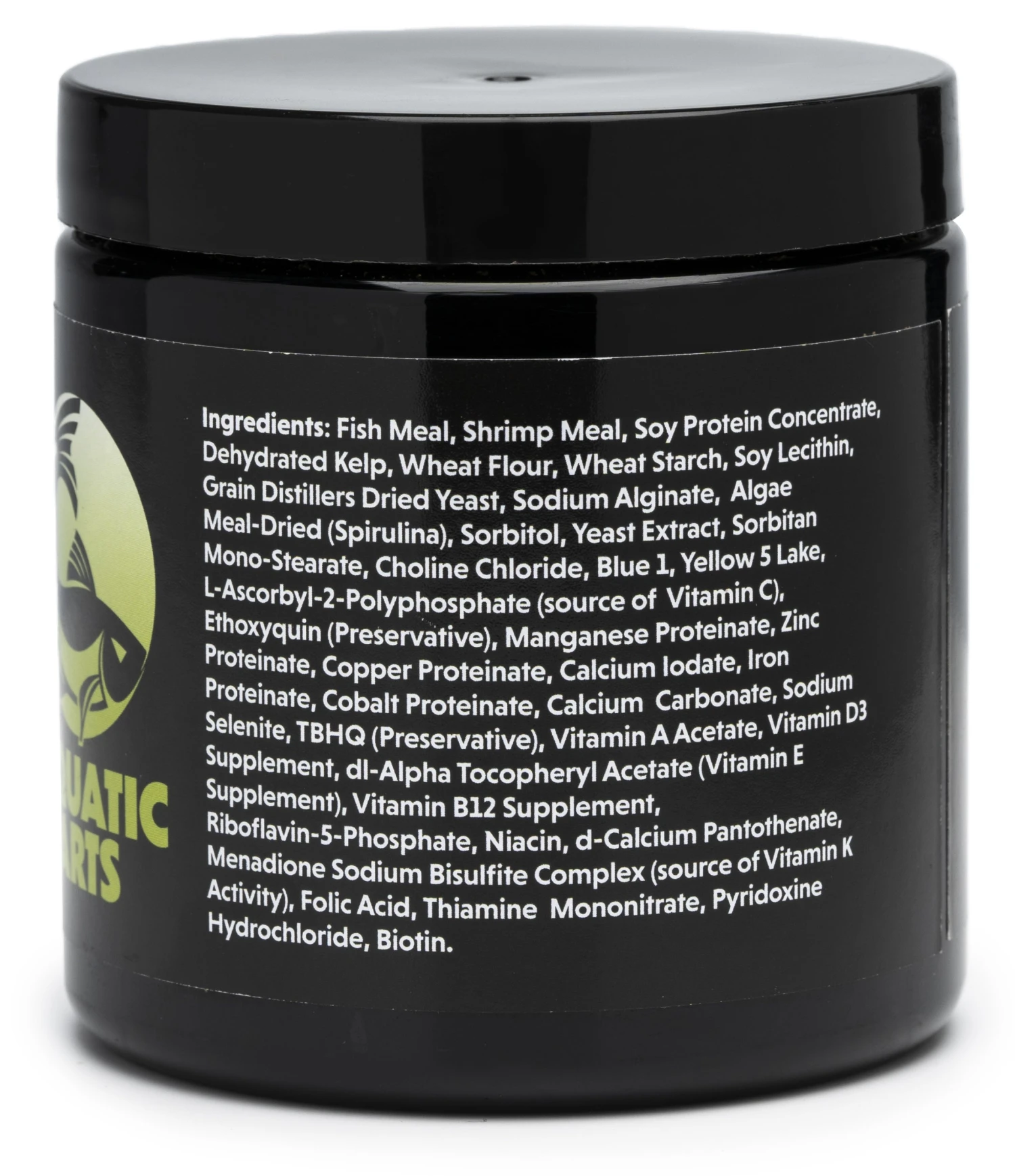 Fish Meal, Shrimp Meal, Soy Protein Concentrate, Dehydrated Kelp, Wheat Flour, Wheat Starch, Soy Lecithin, Grain Distillers Dried Yeast, Sodium Alginate, Algae Meal-Dried (Spirulina), Sorbitol, Yeast Extract, Sorbitan Mono-Stearate, Choline Chloride, Blue 1, Yellow 5 Lake, L-Ascorbyl-2 Polyphosphate (source of Vitamin C), Ethoxyquin (Preservative), Manganese Proteinate, Zinc Proteinate, Copper Proteinate, Calcium Iodate, Iron Proteinate, Cobalt Proteinate, Calcium Carbonate, Sodium Selenite, TBHQ (Preservative), Vitamin A Acetate, Vitamin D3 Supplement, dl-Alpha Tocopheryl Acetate (Vitamin E Supplement), Vitamin B12 Supplement, Riboflavin-5-Phosphate, Niacin, d-Calcium Pantothenate, Menadione Sodium Bisulfite Complex (source of Vitamin K Activity), Folic Acid, Thiamine Mononitrate, Pyridoxine Hydrochloride, Biotin.