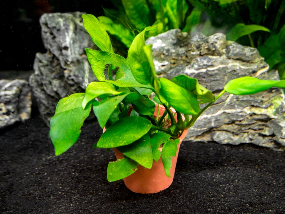 Care for Anubias is relatively easy. It is best placed in the middle ground and will look its best under low to moderate lighting (with the exception of variegated anubias which perfers higher lighting). Excessive lighting may result in unattractive, pesky algae growth on its leaves. However, this algae growth can easily be kept under control in an aquarium with a healthy population of shrimp (especially Amano shrimp) that will constantly graze on the algae without harming the Anubias plant itself. Most herbivorous animals will not harm Anubias whatsoever, although some bio-fim/”wood-eating” Panaque genus plecos may “chew” holes in its leaves. Anubias species has slow and steady in growth and does not seem to respond significantly to CO2 supplementation. It does best when attached to driftwood or rockwork. It can be planted in the substrate but its rhizome (roots) must not be buried in the substrate or it will rot and recede. It can also be planted emersed in terrariums, paludariums, and viquariums.
