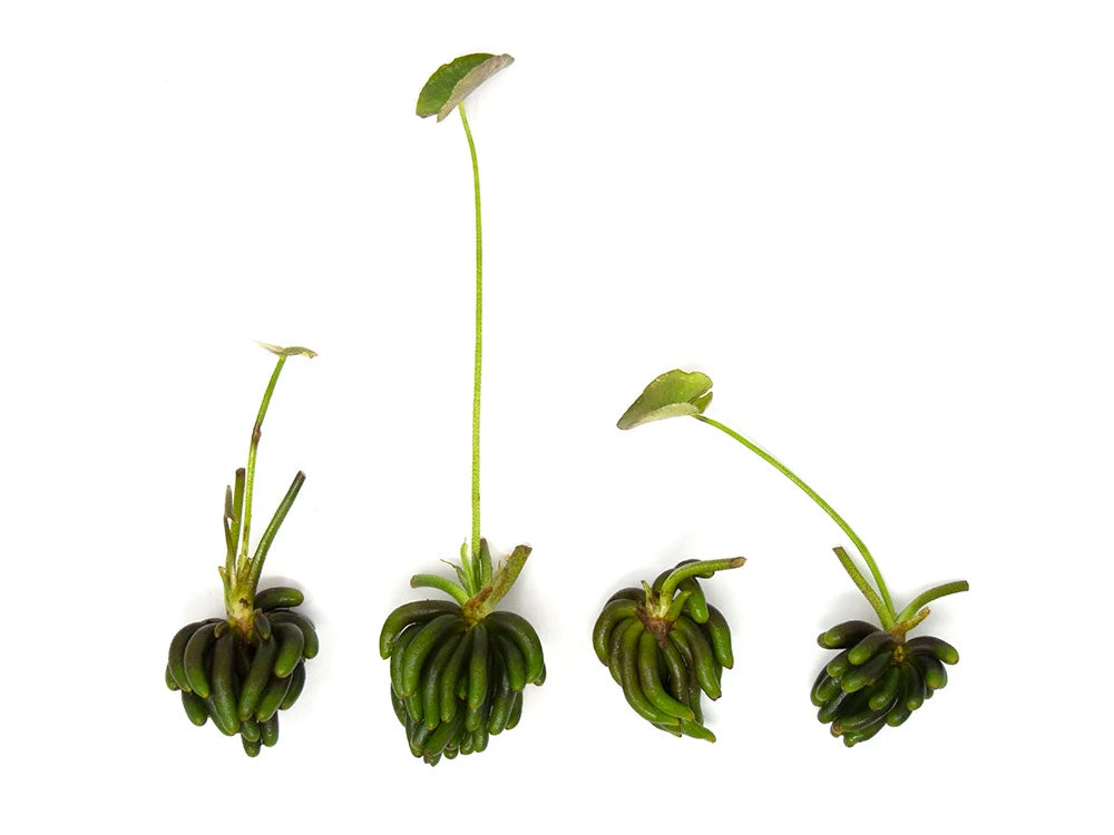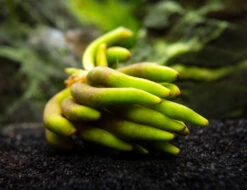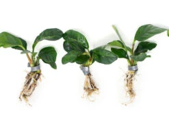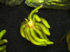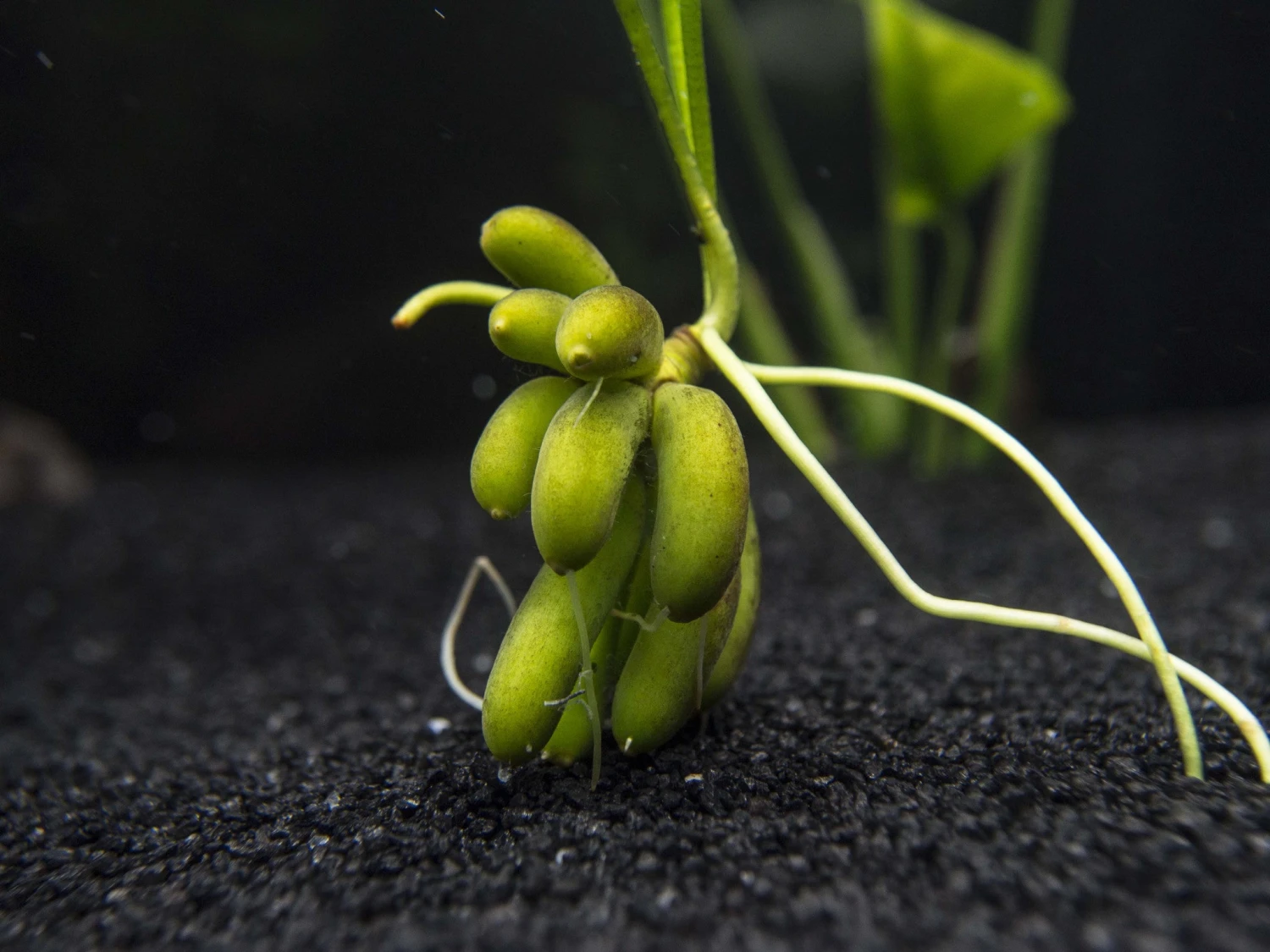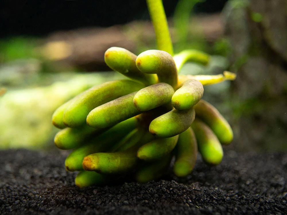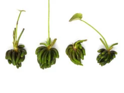 The Banana Plant is quite unusual and is sure to be one of the most compelling plants in any aquascape. It is a rosette plant that is named for its large and highly unique roots, which are banana-shaped and remain partially visible above the substrate. These roots are thick because they are where the plant stores nutrients. The Banana Plant also features round leaves that range from light to dark green. It is also known by the names “Big Floating Heart” and “Banana Lily.”