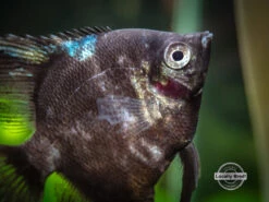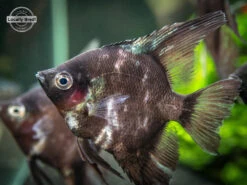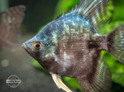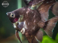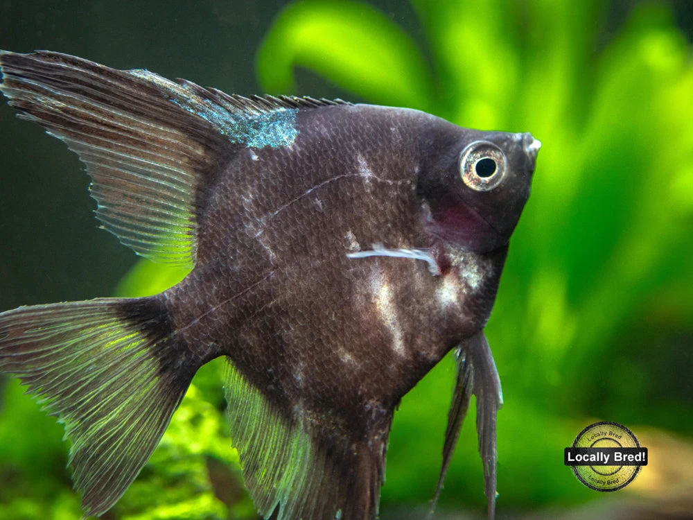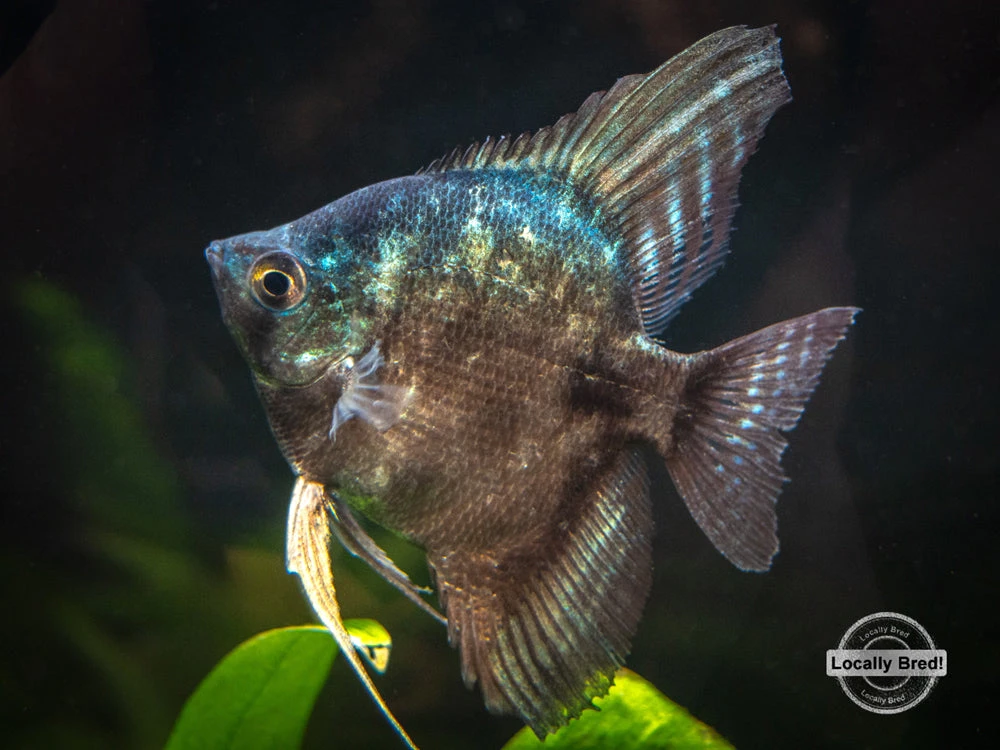 The Black Angelfish (Pterophyllum scalare “Black”) is a classic angelfish variety that is long-beloved in the aquarium hobby. Our specimens of this variety are locally bred and have superb coloration. Many specimens even have some white marbling and a dusting of blue coloration! This shoaling cichlid is relatively peaceful compared to other members of the cichlid family. It also has a very thin, tall body unlike most other cichlids. The Angelfish is indigenous to several river systems in Northern South America, but virtually all specimens in the aquarium hobby have been tank-raised for generations.Â