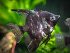 The Black Angelfish will thrive in a heavily planted aquarium with driftwood and/or rock formations and gentle water flow. It is not overly reclusive, but this fish strongly prefers the cover of plants and, due to its body shape, is not likely to seek refuge in rock caves and similar structures. The Black Angelfish is generally compatible with other peaceful fish as long as it has plenty of space. Territoriality is typically at its peak during spawning. Dwarf shrimp and other small, delicate invertebrates should not be kept with the Black Angelfish, but more durable, larger shrimp and snails could possibly make good tankmates in a large enough aquarium. If spawning is desired, tankmates of other species should be kept to a minimum or avoided altogether unless the aquarium is very spacious.