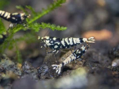 Black Galaxy Pinto Shrimp (Caridina cantonensis) are notorious for their very striking black and white coloration that makes them stand out magnificently against any backdrop or substrate.  Though similar to our Crystal Black Shrimp, these tend to be more uncommon and offer a more broken “galaxy” pattern.
