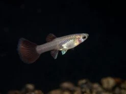 The Black Metal Snakeskin Guppy (Poecilia reticulata) is a very uncommon guppy type that displays an irridescent snakeskin pattern and a body that boasts a deep black color. This variety is very rarely seen in the hobby!
