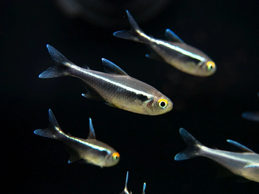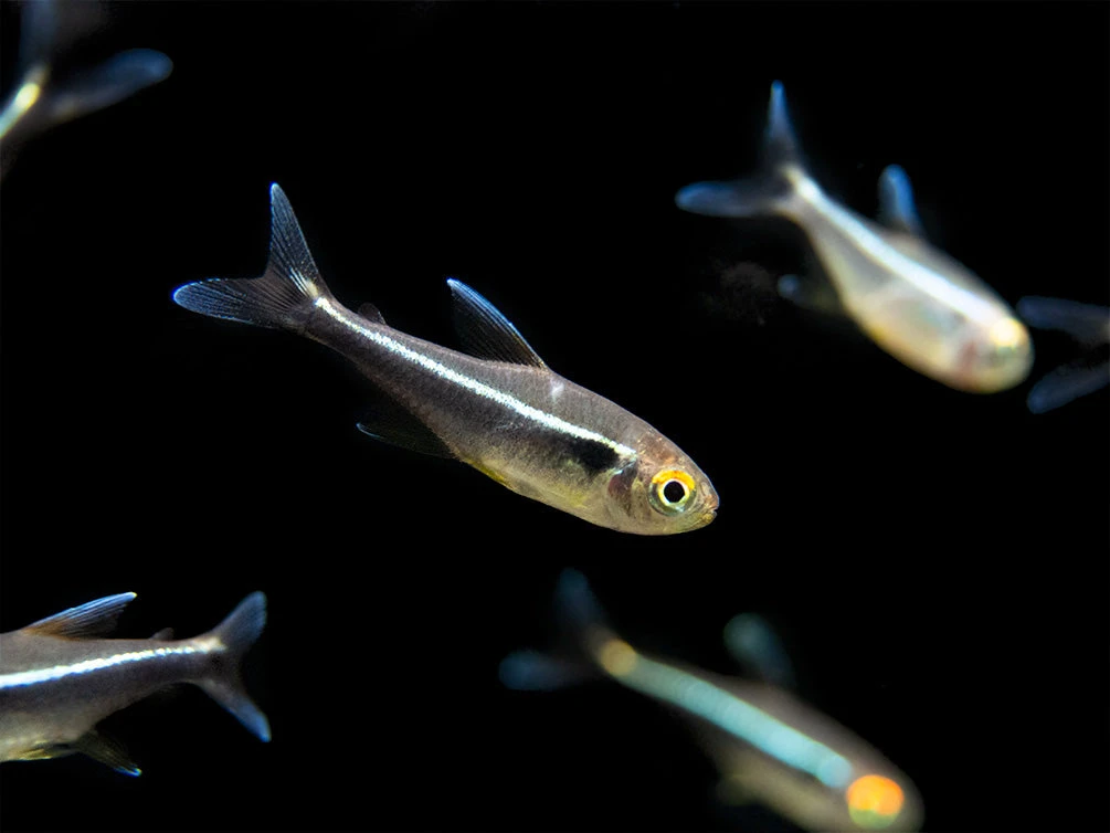 The Black Neon Tetra (Hyphessobrycon herbertaxelrodi) is an excellent choice for the community aquarium, especially planted aquariums. Its overall bold, black coloration is attractively highlighted with a bright, horizontal cream/white stripe across its body, as well as bright orange coloration at the top of its eye. This is a very durable and peaceful fish that is suitable for beginners and experts alike!