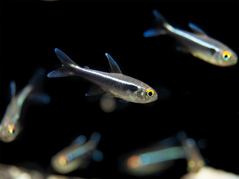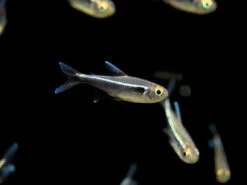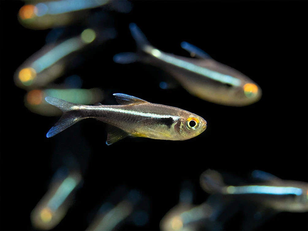 The Black Neon Tetra typically occupies the top and middle level of the water column, although it can often be seen swimming and feeding in the middle and bottom levels as well. It is safe with other peaceful, small fish. Adult dwarf shrimp are generally safe as well, but adult the Black Neon Tetra may eat small dwarf shrimp and their fry. Larger, peaceful invertebrates can also make good tankmates. The Black Neon Tetra must be kept in schools of 6 or more. Since it is tank-raised, this fish is very adaptable, but its natural habitat contains soft, acidic water rich in tannins and leaf litter.