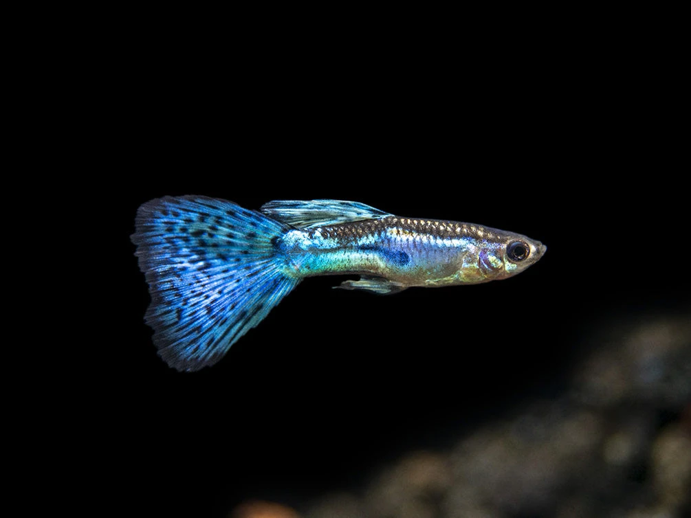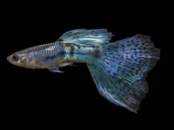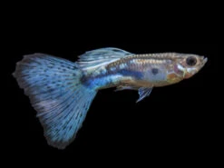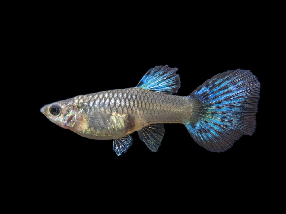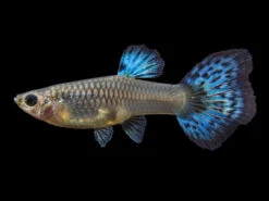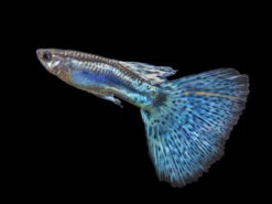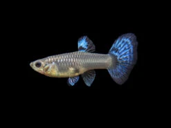 The Blue Grass Tail Guppy (Poecilia reticulata) is a very striking guppy variety that boasts an assortment of blue coloration in males. Males display this color across the entire body and all fins, but females are also colorful in their own right!