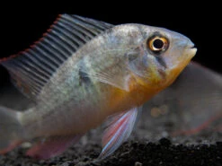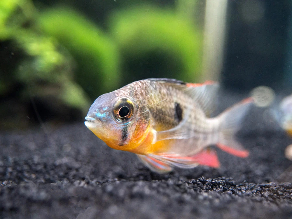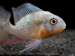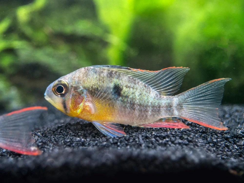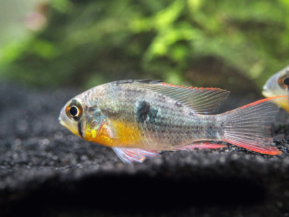 The Bolivian Ram Cichlid will thrive in an aquarium with a sandy substrate and plenty of refuge such as clay pots, driftwood, and rock formations. It is an excellent candidate for the planted aquarium, but it also needs a fair amount of open space. This cichlid is generally compatible with other peaceful fish as long as it has plenty of open terrain. Territoriality is typically at its peak during spawning, but this species tends to thrive and show its best coloration in groups of 6 or more. Dwarf shrimp and other small, delicate invertebrates should not be kept with the Bolivian Ram Cichlid, but more durable, larger shrimp and snails could possibly make good tankmates in a large enough aquarium If spawning is desired, tankmates of other species should be kept to a minimum or avoided altogether. While it is not an exceptionally aggressive species, some aquarists report that the Bolivian Ram is more territorial than other “Ram” cichlids.