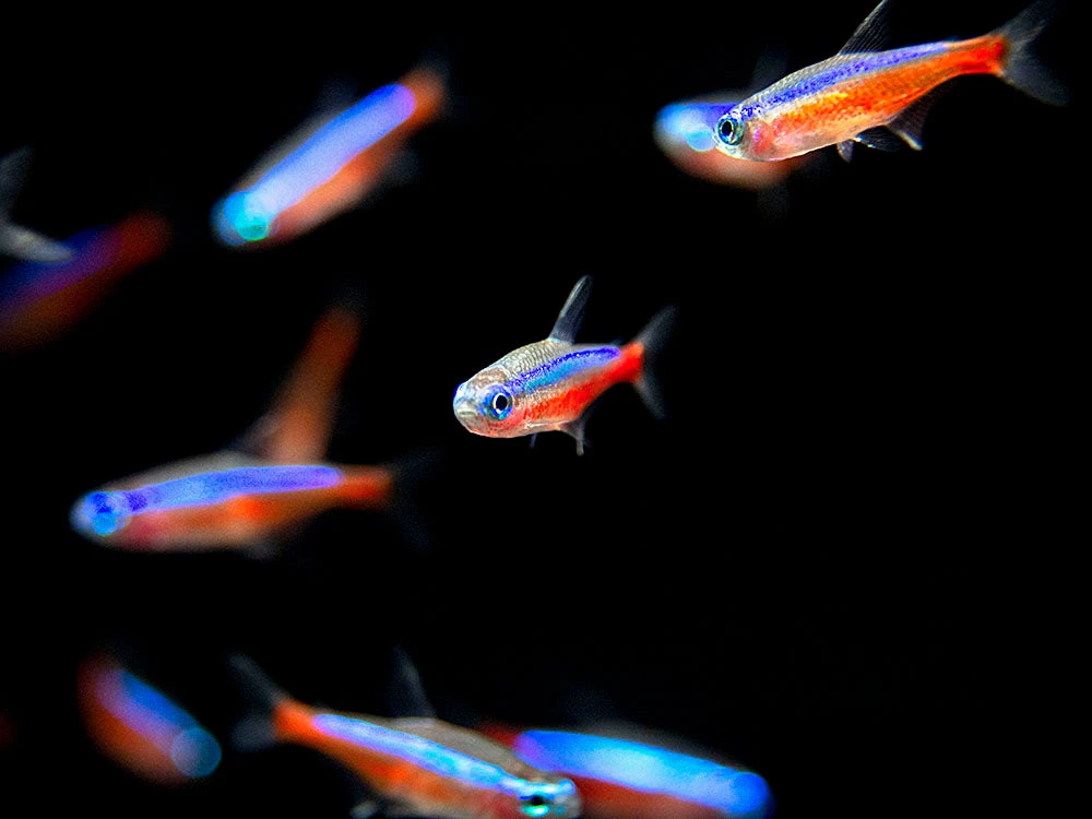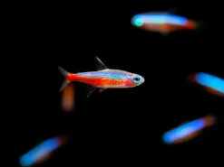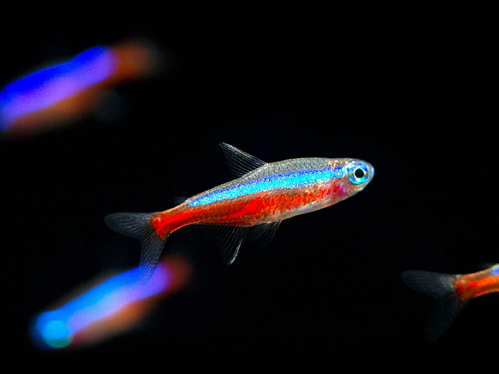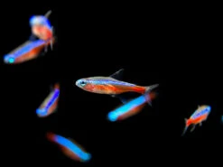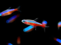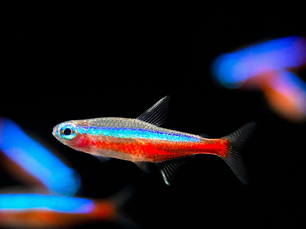 The Cardinal Tetra (Paracheirodon axelrodi) is a very popular schooling community fish. It is very similar to the Neon Tetra, but has more neon red and blue coloration, is often somewhat hardier, and is slightly larger. Its care and behavior are nearly identical to the Neon Tetra.