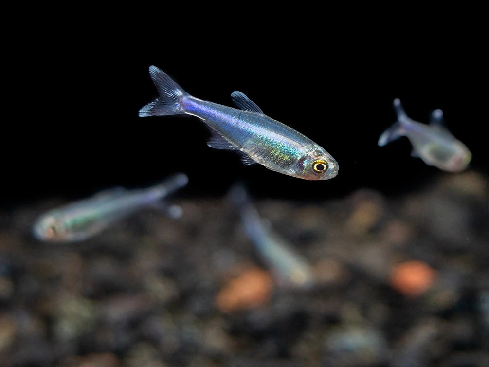 Cochu’s Blue Tetras typically occupy the top and middle level of the water column, although they can often be seen swimming and feeding in the middle and bottom levels as well.  This tetra is safe with most other peaceful fish, provided that there is plenty of space in the aquarium. It is extremely active, especially at feeding time, so it can be intimidating to slower-moving fish and it may nip at long-finned fish.  This harassing behavior is much less likely in a larger aquarium.  Larger, peaceful invertebrates can also make good tankmates. This fish could possibly be kept with adult dwarf shrimp, but we do not recommend it in most aquariums due to the extremely active nature of this tetra.  Cochu’s Blue Tetra must be kept in schools of 6 or more. Since it is tank-bred, this fish is very adaptable, but its natural habitat contains soft, acidic water that is rich in tannins and leaf litter.  Its colors will be brightest with dark substrate.