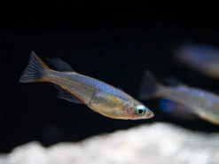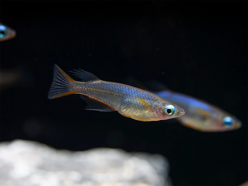 The Daisy’s Blue Ricefish must be kept in schools of 6 or more. Not only will it display its best natural behavior and coloration in large schools, but it will also pay little attention to other species. This tank-raised fish is very hardy and adaptable, but it requires clean, well-maintained water to thrive and it will display optimal coloration and health in a planted aquarium with dark substrate, especially where floating plants are present. As long as it has plenty of cover, it is an extremely outgoing species. It is very easy to breed in the aquarium. It has the ability to jump, so a secure aquarium lid is necessary.