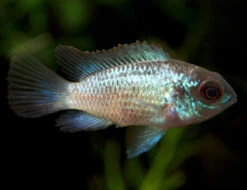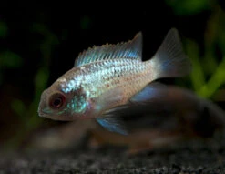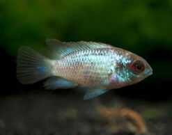 The Electric Blue Acara Cichlid will thrive in an aquarium with a sandy substrate and plenty of refuge such as clay pots, driftwood, and rock formations. It typically will not eat ornamental plants, but it does like to do a fair amount of digging, so plants that attach to driftwood and rockwork are recommended. This cichlid is generally compatible with other peaceful fish too large to be considered prey. Territoriality is typically at its peak during spawning. Dwarf shrimp and other small, delicate invertebrates should not be kept with the Electric Blue Acara Cichlid, but more durable, larger invertebrates such as snails could possibly make good tankmates in a large enough aquarium. If spawning is desired, tankmates of other species should be kept to a minimum or avoided altogether.