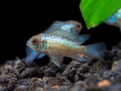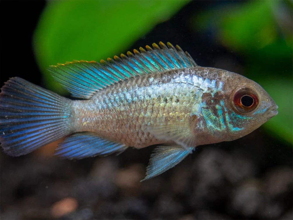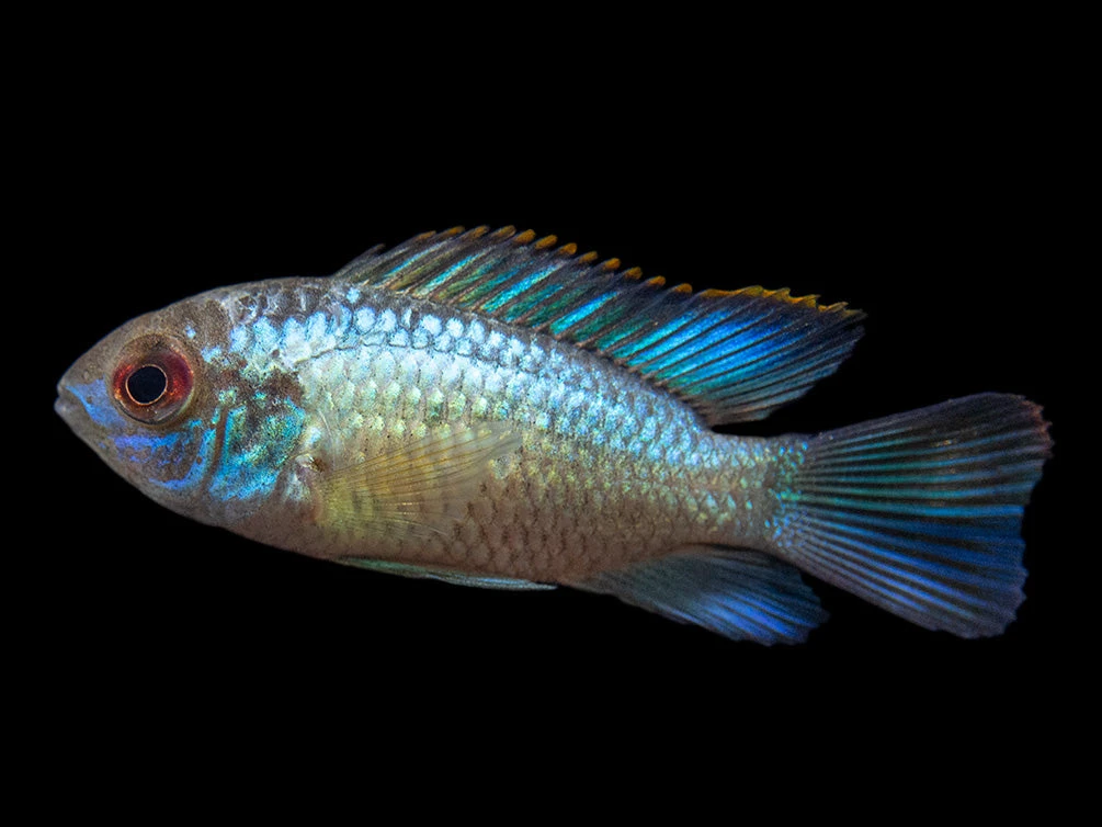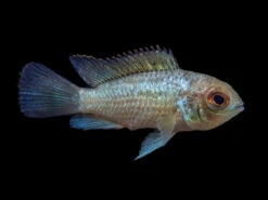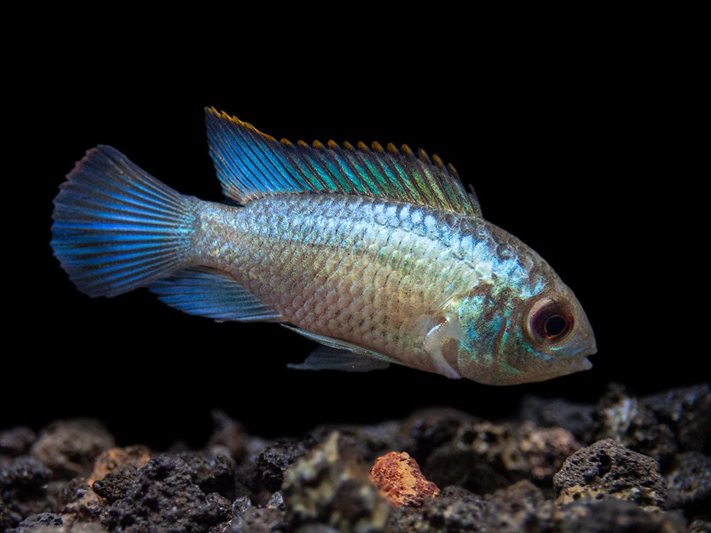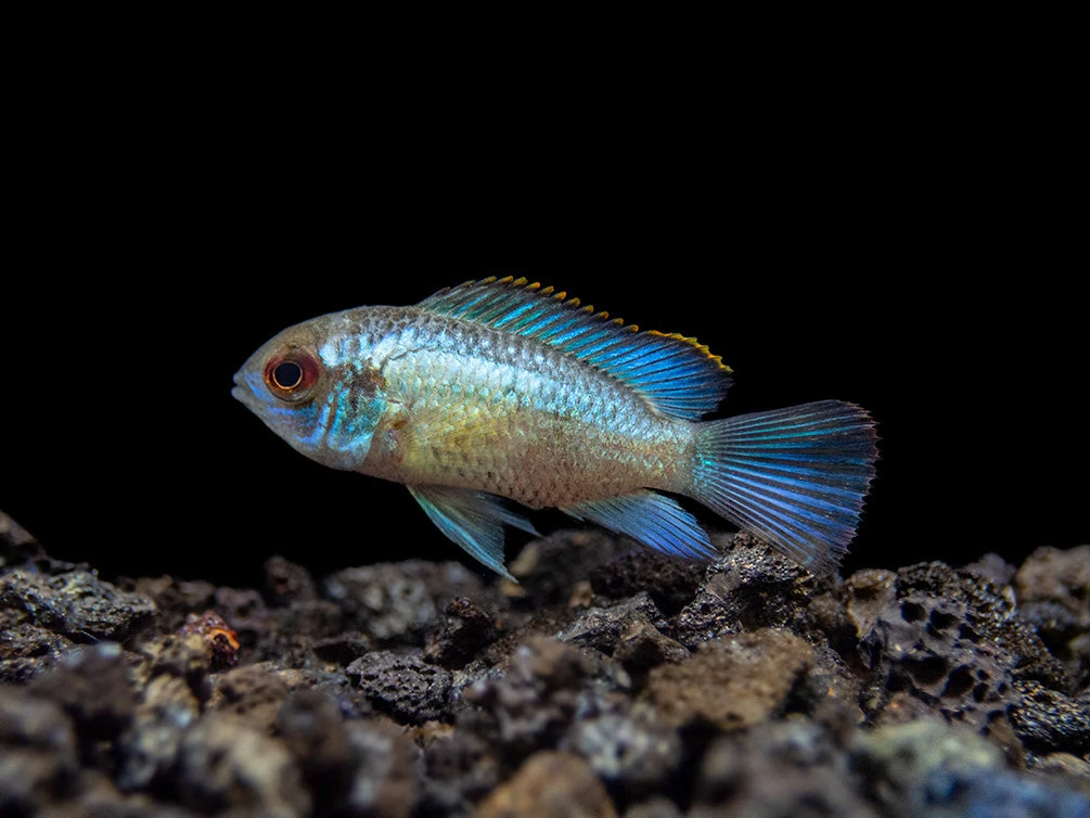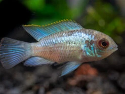 The Electric Blue Acara Cichlid displays intense blue coloration across most of its body, an orange margin on its dorsal fin, and is truly a “centerpiece” fish!