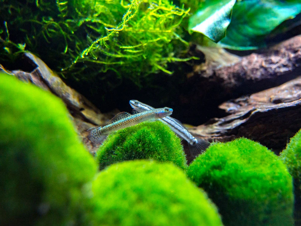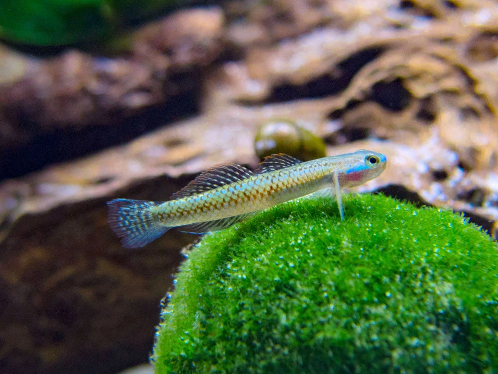 This beautiful nano fish displays bright neon blue coloration in males, is very peaceful with dwarf shrimp, and is very hardy in a mature aquarium that is rich in algae and biofilm.