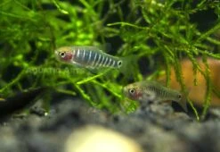 Emerald Dwarf Rasboras are tiny little fish with lots of spunk! They usually feature a beautiful coral pink or sun-kissed orange coloration, but what really makes them stand out is the striking turquoise green stripes along their sides that glow brilliantly under any lighting (these stripes may appear more purple in color on some fish). They also have a dark spot at the base of their caudal fin. Â Males tend to be a bit smaller than the females and have red or orange fins, while females have clear fins and are a bit less colorful than their male counterparts. Their diminutive size makes them perfect for nano tanks!