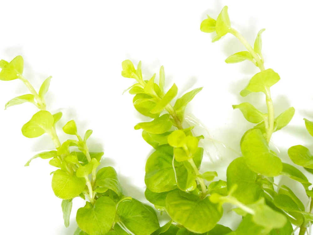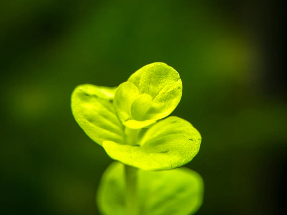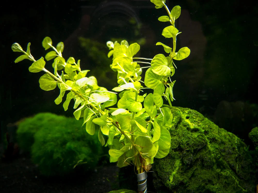 Golden Lloydiella (Lysimachia nummularia “Aura”) is a very hardy, attractive stem plant with golden-green leaves. It can thrive in low-tech setups as long as it has moderate to (preferably) high lighting. As it matures, itcan grow to an impressive height that is very suitable for the background of the aquarium. There are many variants of this species, and the golden/aura variant is known for its lvibrant coloration. While Golden Lloydiella naturally grows emersed, it is very adaptable to long-term submersed conditions. In addition to being an excellent aquarium plant, it is also ideal for paludariums and terrariums.