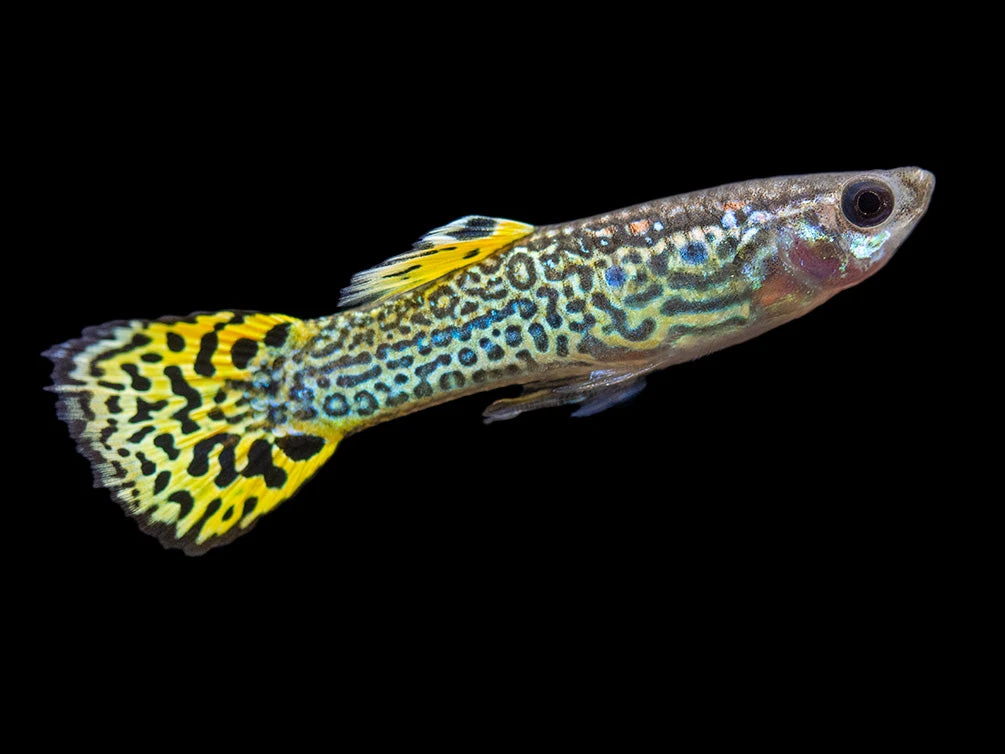The Green Cobra Guppy boasts psychedelic patterns of green, yellow, and blue in males, plus females have vivid tail coloration!