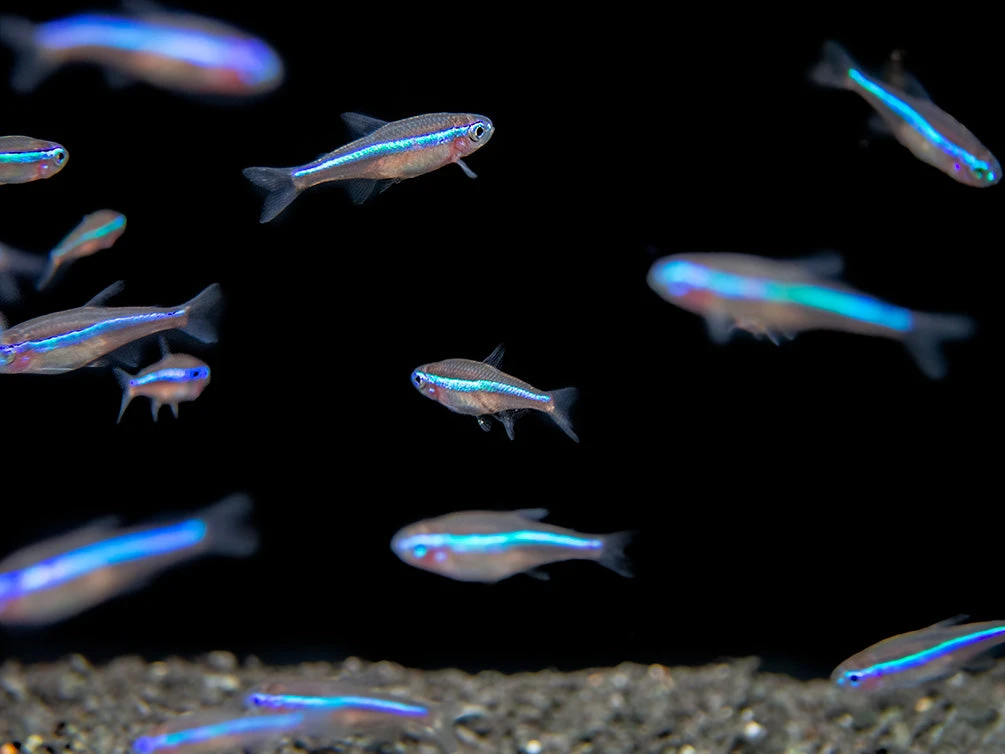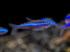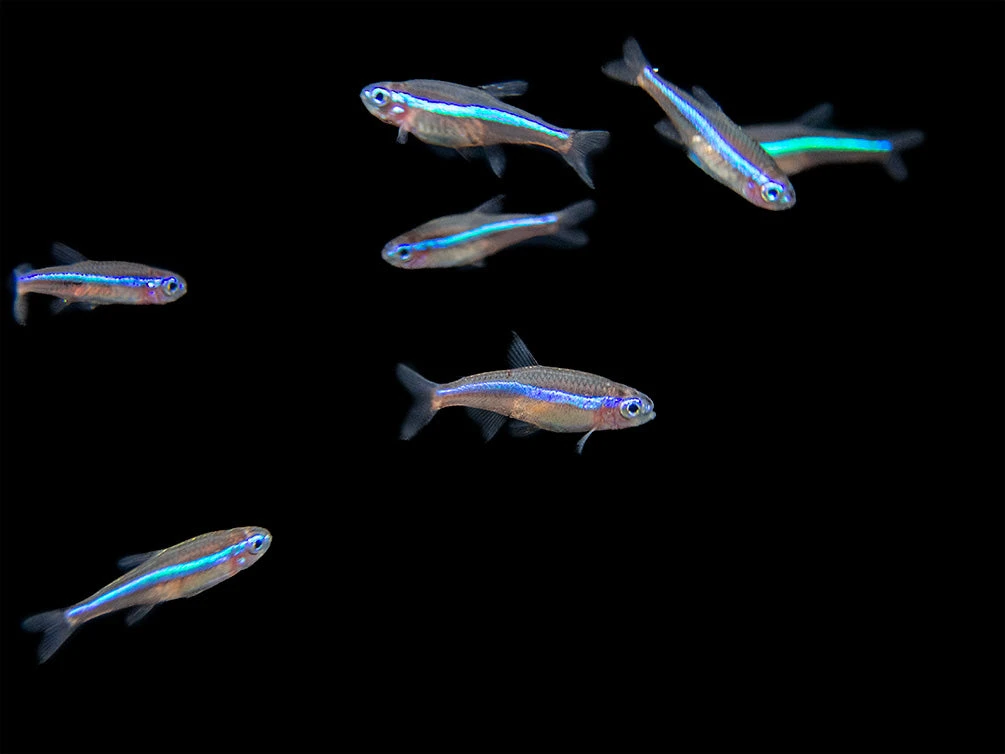 The Green Neon Tetra typically occupies the top and middle level of the water column, although it can often be seen swimming and feeding in the middle and bottom levels as well. It is safe with other peaceful, small fish. Adult dwarf shrimp are generally safe as well, but the Green Neon Tetra may prey on dwarf shrimp fry. Larger, peaceful invertebrates can also make good tankmates. The Green Neon Tetra must be kept in schools of 6 or more. Since it is tank-raised, this fish is very adaptable, but its natural habitat contains soft, acidic water rich in tannins and leaf litter. This species requires significantly warmer water than many other tropical fish. Please see care guidelines below.