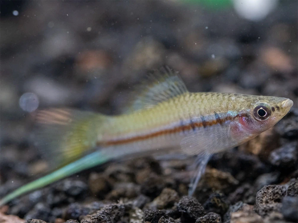 The Green Swordtail (Xiphophorus helleri) is the “wild form” color variety of this classic livebearer that has been consistently popular in the aquarium hobby for many decades. It has a variety of green, maroon, and yellow coloration. As is typical with swordtails, males have a long “sword” extension at the bottom of the tail, which is often a striking blue in this variety.
