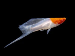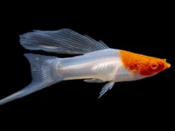 The Hi Fin Tancho Kohaku Swordtail (Xiphophorus helleri) is a rather uncommon and very colorful swordtail variation that has extremely vivid orange and white/silver koi-like coloration. This hi fin variant offers an elongated dorsal fin, and orange head, similar to that of a red cap goldfish. As is typical with swordtails, males often have a long “sword” extension at the bottom of the tail, although some females can also develop a sword. Reliable sexing can be done by checking the anal fin area for the male gonopodium, a tube-like organ used in fertilization during spawning. Like most swordtail varieties, the Hi Fin Tancho Kohaku Swordtail is a variant of the wild Green Swordtail (Xiphophorus helleri), but it also has genetics of other Xiphophorus species (such as X. maculatus and X. variatus platy varieties) to achieve new color patterns.Â