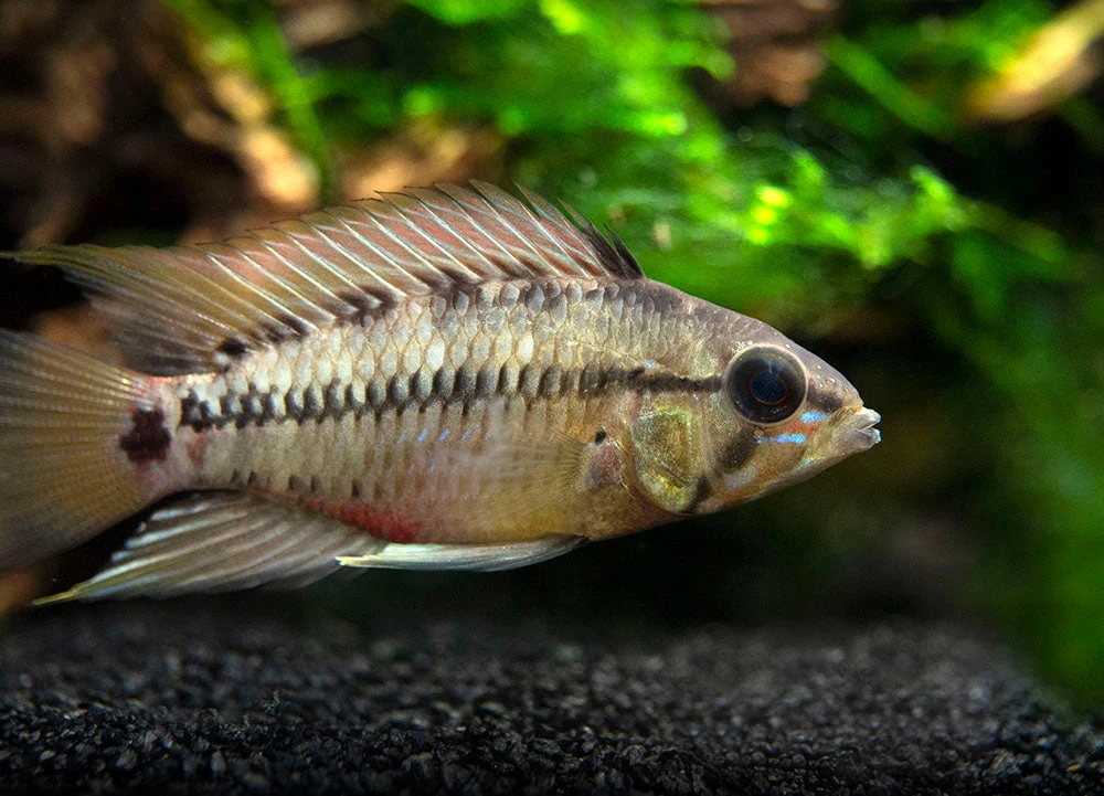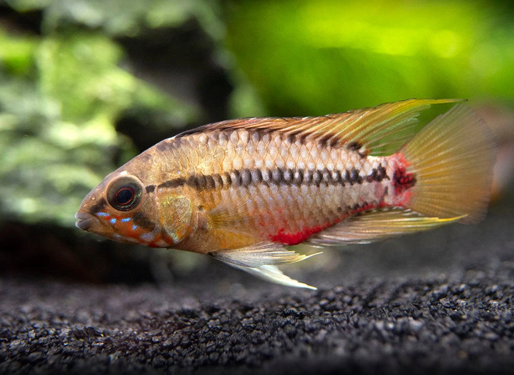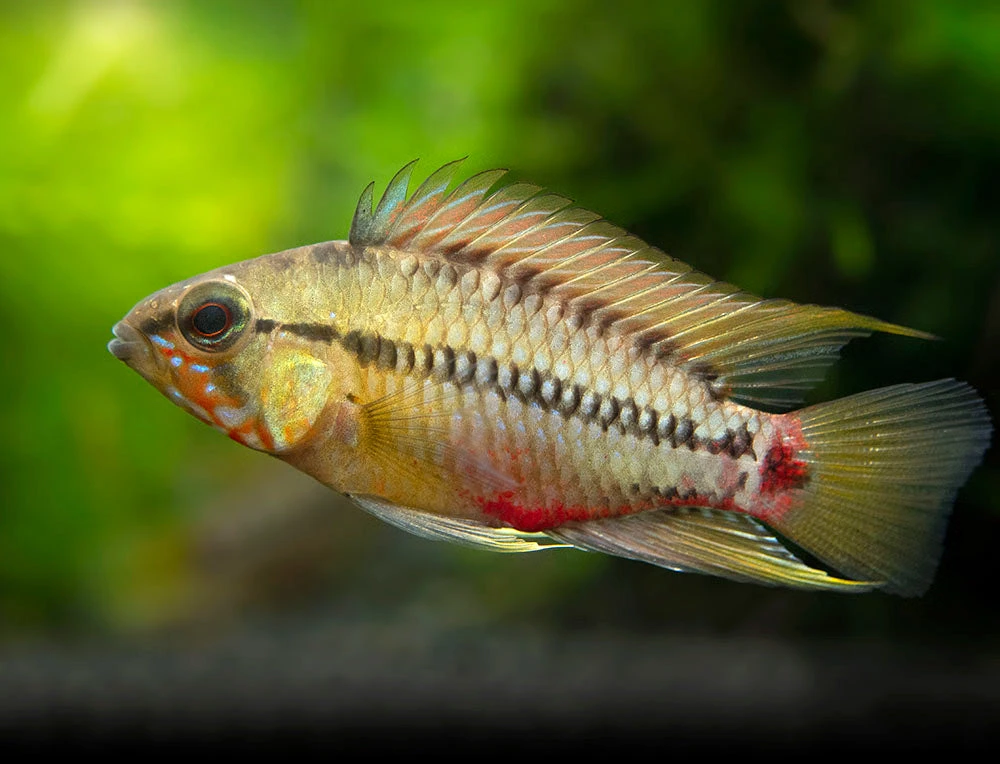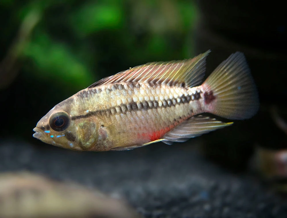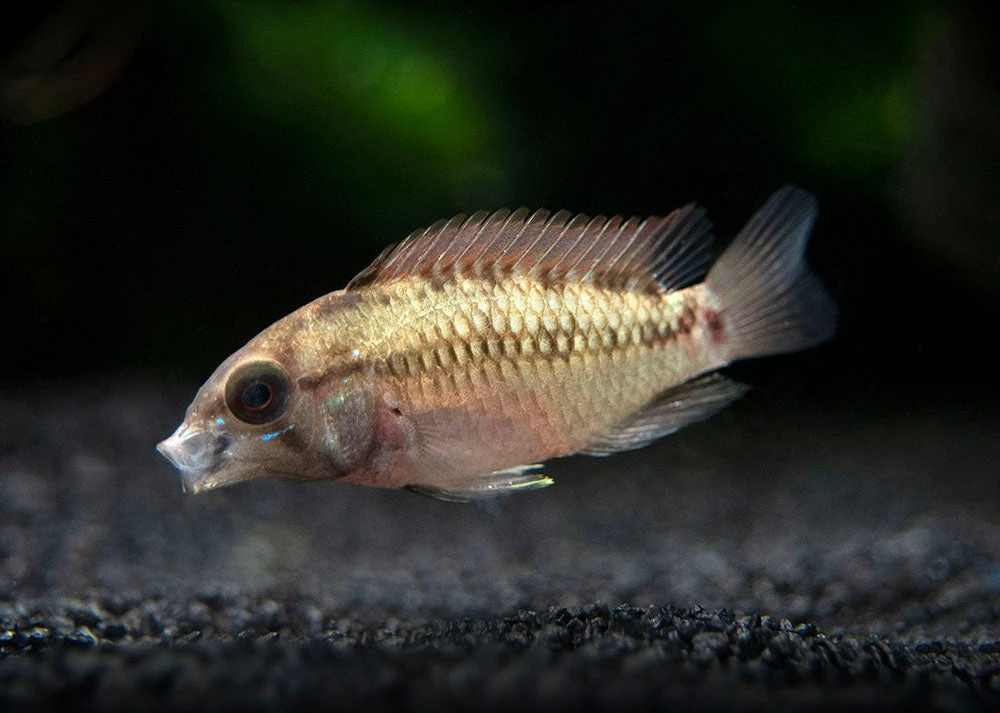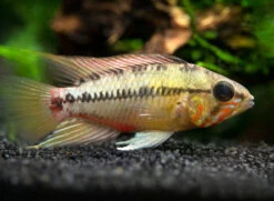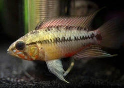Hongslo’s Dwarf Cichlid is very distinctive by the pink coloration that it develops on its face, underside, and fins, sometimes even in females!