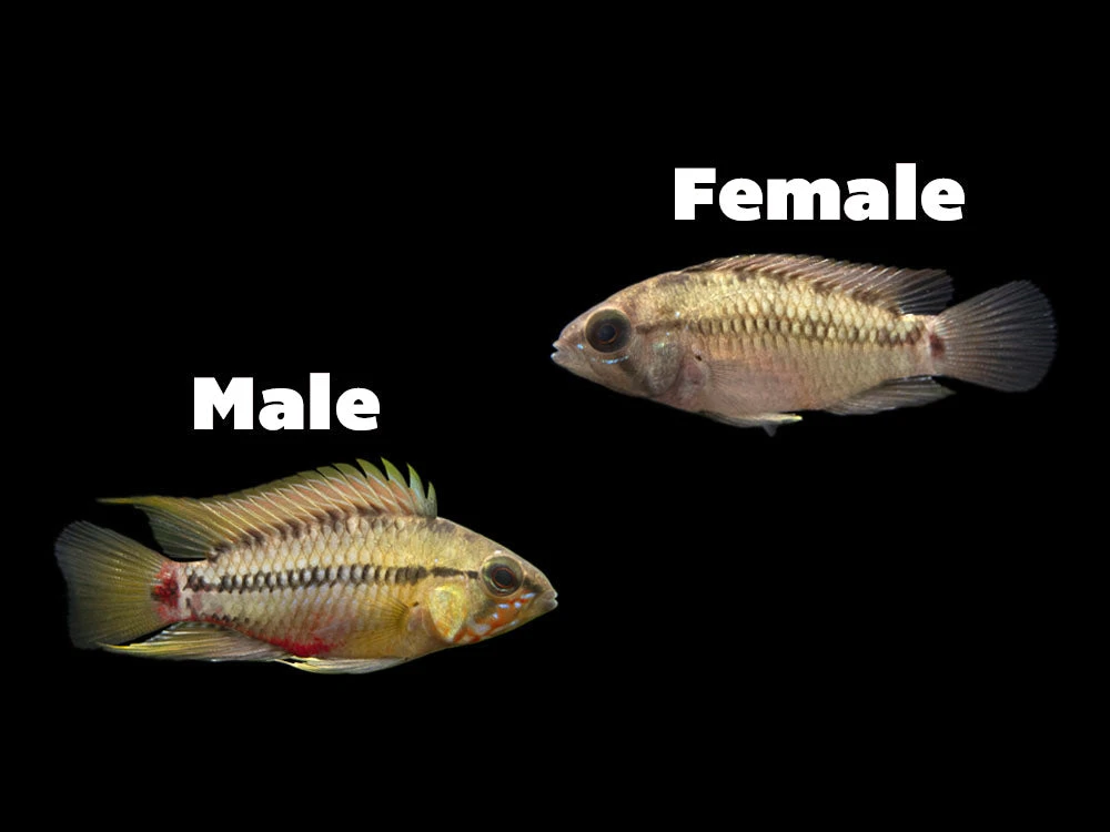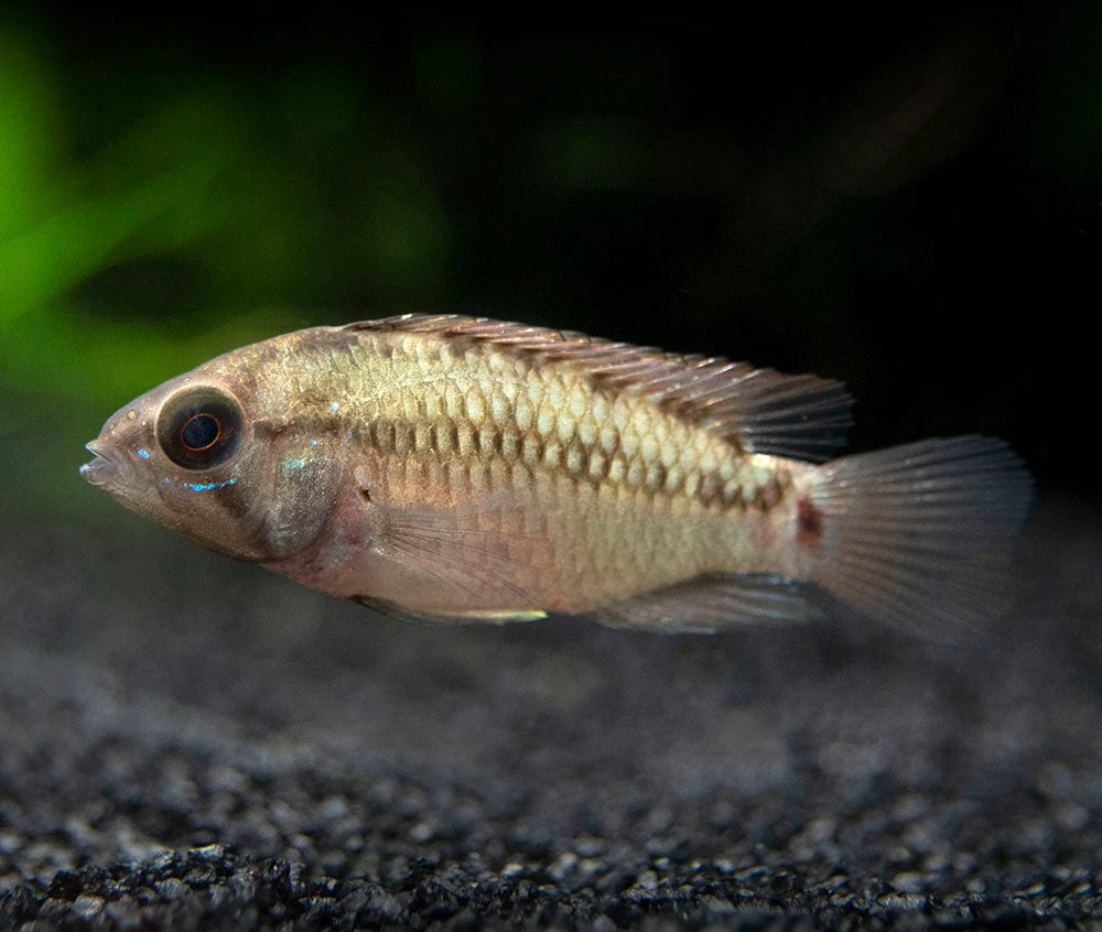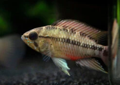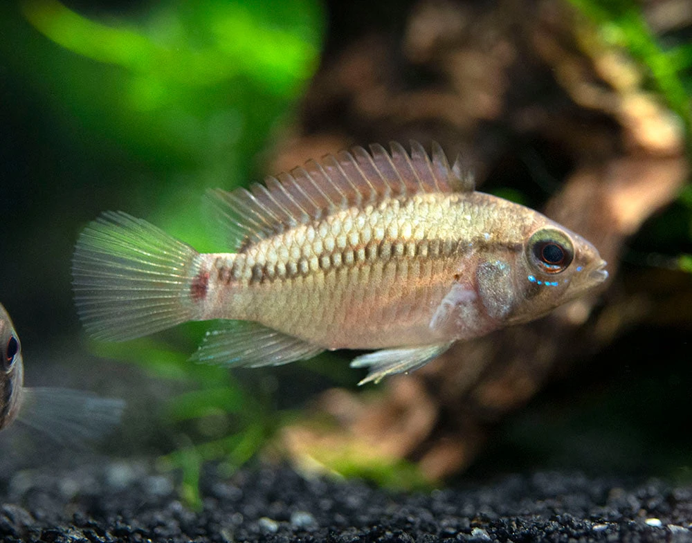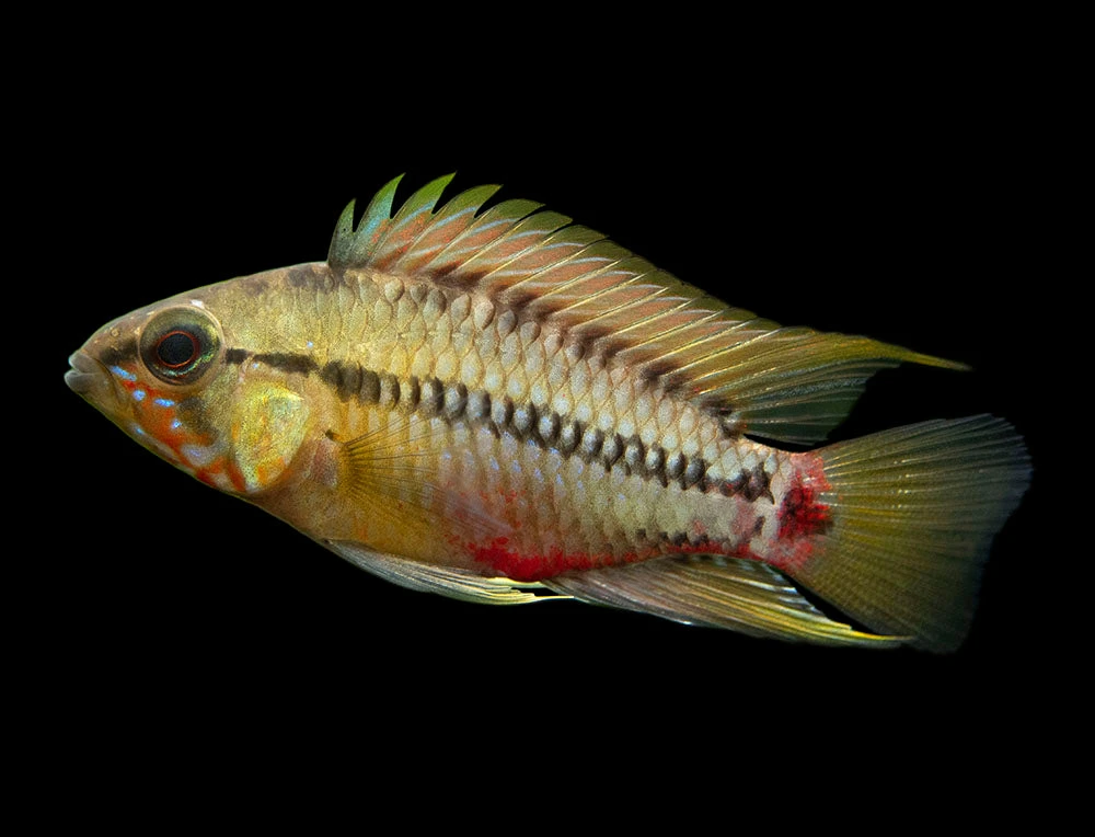 Hongslo’s Dwarf Cichlid is very distinctive by the pink coloration that it develops on its face, underside, and fins, sometimes even in females!