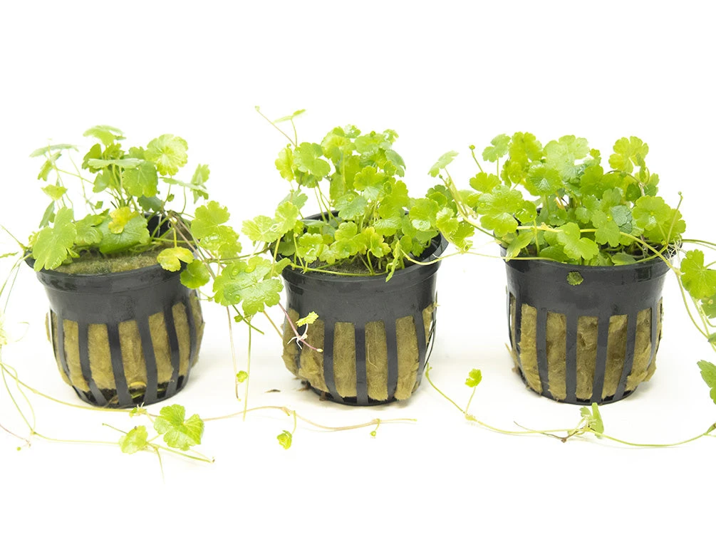 This variety of Japanese Dwarf Pennywort can thrive in low to high lighting. It tends to grow densely and horizontally in high lighting, and it grows much more slowly, loosely, and horizontally in lower lighting. Its trimmings can be replanted to increase the size of the mat. If used for carpeting the aquarium, it should be trimmed weekly to promote horizontal growth. It does not require substrate, but does seem to absorb some of its nutrients through its roots when planted in substrate or attached to another surface. It will also sometimes even grow over rocks and mats. It will also benefit from CO2 supplementation, but this is not required. In fact, it will require much more frequent trimming when CO2 supplementation due to the dramatically increased, denser growth rate that such supplementation will promote.