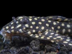 The White Spotted Dwarf Hypancistrus Pleco is primarily nocturnal, but will often become active during daytime hours once established in an aquarium with plenty of driftwood, rockwork, and other hiding places. It is not known to eat wood heavily like some plecos (Panaque sp., etc.), but it may benefit from some supplementary wood (or bio-film on driftwood). The White Spotted Dwarf Hypancistrus Pleco will not bother most plants and it is not an effective algae eater. Feed the White Spotted Dwarf Hypancistrus Pleco a diet heavy in both meaty and vegetable matter, including high-quality vegetable flakes, sinking algae wafers and pellets. Like most Hypancistrus species, the White Spotted Dwarf Hypancistrus Pleco is omnivorous, but but it leans heavily on the carnivorous side. It will also appreciate being fed some fresh vegetables such as shelled peas, spinach, zucchini and cucumber. Meaty foods such as bloodworms are definitely necessary for this species, especially in comparison to some other “pleco” species. This species also requires a very clean, well-maintained aquarium with moderate to high water flow in order to thrive.