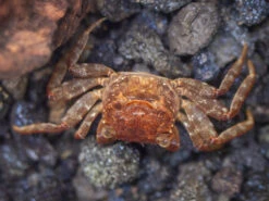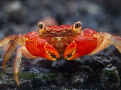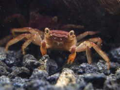 The Lars’s Maroon Red Vampire Crab (Geosesarma larsi) is a small, very colorful, semi-terrestrial species that is native to Java, Indonesia. It inhabits forest areas near streams, rivers, and ponds. It spends most of its time on land, but also often submerges in freshwater, including when it molts. It is communal with its own species. Males typically are larger, more colorful, and also have much larger claws than females.