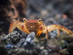Like most crabs, the Vampire Crab is an omnivorous scavenger and an opportunistic hunter on occasion. It feeds on filamentous algae and detritus in the paludarium and will also readily accept high-quality dry foods that are rich in plant matter. Fresh and dried vegetables are also excellent food sources, as are insects, worms, and other invertebrates. Due to its opportunistic nature, the Vampire Crab might eat other ornamental invertebrates and fish, so its tankmates must be chosen with great care.
