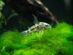 The Longfin Peppered Cory Catfish is a very peaceful schooling fish that is compatible with most nano aquarium animals. It might eat dwarf shrimp fry, but is generally safe to keep with adult dwarf shrimp. It is a classic scavenger and will inhabit and feed at the aquarium floor, which should be comprised of sand or smooth gravel. Very coarse substrate can damage its delicate barbells and underbelly. This fish is otherwise very undemanding as it will accept most dry and frozen foods. It is adaptable to most tropical freshwater conditions as long as standard regular maintenance is performed.