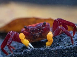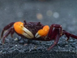 Like most crabs, the Orange Arm Borneo Crab is an omnivorous scavenger and an opportunistic hunter on occasion. It feeds on filamentous algae and detritus in the paludarium and will also readily accept high-quality dry foods that are rich in plant matter. It also consumes animal matter, so bloodworms, cyclops, and similar frozen or dry foods are recommended. Fresh and dried vegetables are also excellent food sources, as are insects, worms, and other invertebrates. Due to its opportunistic nature, the Orange Arm Borneo Crab might eat other ornamental invertebrates and fish, so its tankmates must be chosen with great care.