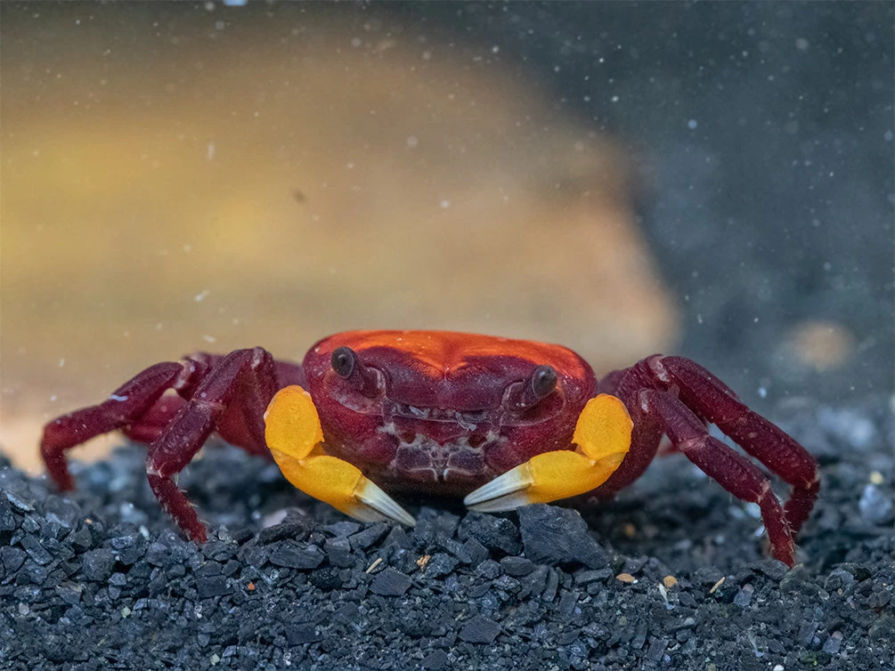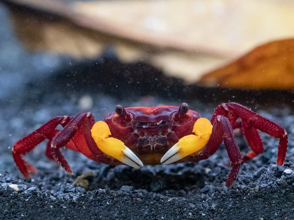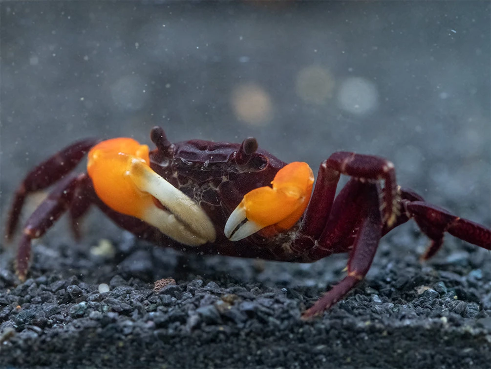 PLEASE NOTE: This species is a semi-terrestrial crab. Its habitat must be at least half (and preferably more) land with freshwater. It is an ideal paludarium animal.