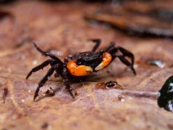 The Orange Clawed Borneo Crab (Lepidothelphusa sp.) is a small, very colorful, semi-terrestrial species that is native to Java, Indonesia. It inhabits forest areas near streams, rivers, and ponds. It spends most of its time on land, but also often submerges in freshwater. It is communal with its own species, and males typically have one larger and one smaller claw while females have two equally sized claws .