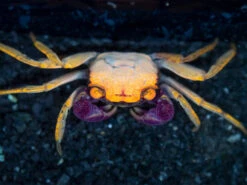 The Orange Disco Vampire Crab (Geosesarma tiomanicum) is a small, very colorful, semi-terrestrial species that is native to Java, Indonesia. It inhabits forest areas near streams, rivers, and ponds. It spends most of its time on land, but also often submerges in freshwater, including when it molts. It is communal with its own species, and males typically are larger than females, and also have much larger claws.