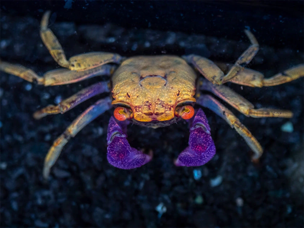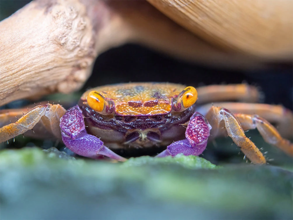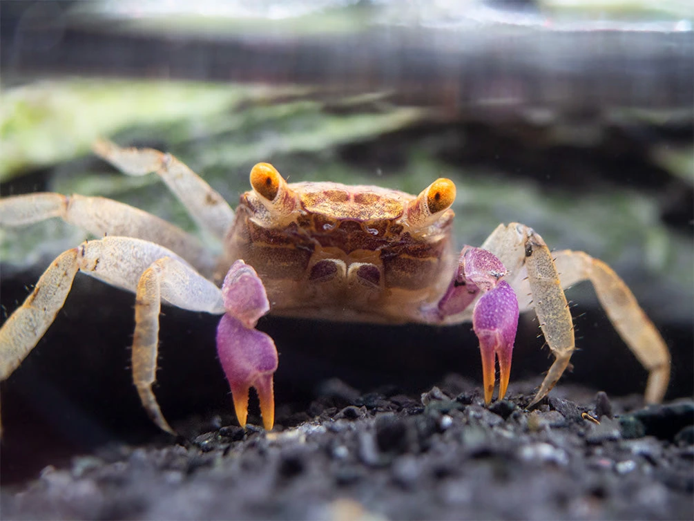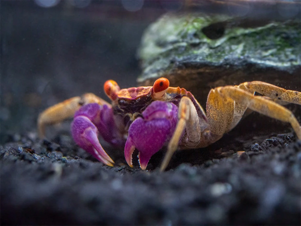 PLEASE NOTE: This species is a semi-terrestrial crab. Its habitat must be at least half (and preferably more) land with freshwater. It is an ideal paludarium animal.