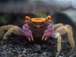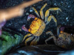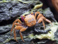 Like most crabs, the Orange Disco Vampire Crab is an omnivorous scavenger and an opportunistic hunter on occasion. It feeds on filamentous algae and detritus in the paludarium and will also readily accept high-quality dry foods that are rich in plant matter. Fresh and dried vegetables are also excellent food sources, as are insects, worms, and other invertebrates. Due to its opportunistic nature, the Orange Disco Vampire Crab might eat other ornamental invertebrates and fish, so its tankmates must be chosen with great care.