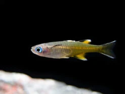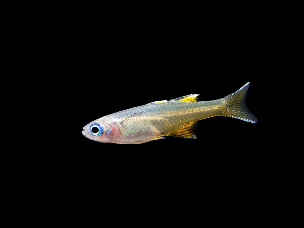 The Pacific Blue Eye Signifer Rainbowfish (Pseudomugil signifer) is the most widespread and variable of the blue eye rainbowfish that inhabit the freshwater and brackish rivers and estuaries of coastal Western Australia. It lives in very large schools in areas with dense vegetation, so it is an ideal candidate for the planted aquarium. While some populations of this fish inhabit brackish or even fully marine water, it is not necessary to provide brackish water in the aquarium. Males display brilliant yellow to orange coloration on their bodies and fins, particularly while competing/posturing with other males. Females also possess this attractive coloration, but to a lesser extent. Both males and females feature stunningly bright blue eyes that contrasts beautifully with their yellow to orange bodies.
