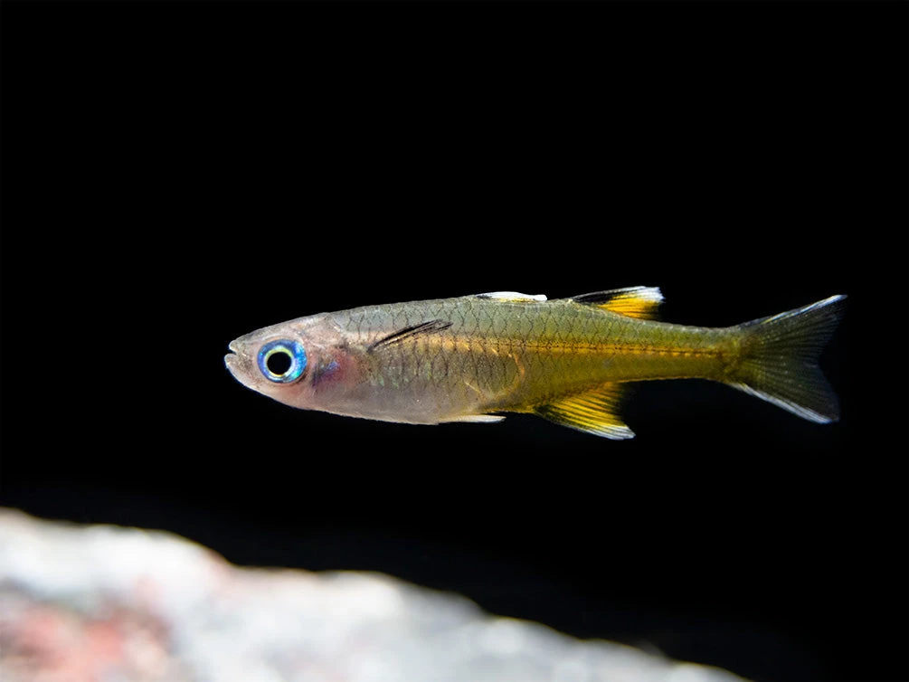 The Pacific Blue Eye Signifer Rainbowfish is generally peaceful with other fish species of similar size, but smaller shrimp fry may fall prey. The most intense color will be displayed when this fish kept in schools of 6 or more, including multiple males, in a heavily planted, spacious aquarium to ensure that subdominant males are not overly harassed by dominant males. As with many rainbowfish, darker substrate will also often result in better coloration.