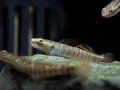 The Palauan Riffle Dwarf Goby (Stiphodon pelewensis) is a very rare freshwater dwarf goby that is native to Micronesia and possibly other Pacific islands. It is known for the deep turquoise and black color that dominant male specimens display at maturity. Females are not as colorful, but are still very attractively marked with horizontal black and cream-colored stripes.  This fascinating, peaceful fish is an algae and biofilm grazer that is an excellent candidate for the mature nano aquarium. Â