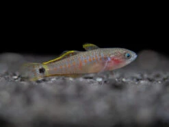 We offer tank-bred specimens, but the Peacock Gudgeon is native to Papua New Guinea. This fish boasts neon red and blue vertically striped body coloration, similar to the Scarlet Badis (Dario dario), but it also has a neon yellow margin along the edge of all of its fins. Mature males have a noticeably rounded head. This fish does well and best displays its optimal color and social behavior in groups of 6 to 8 or more, although a pair can do very well in a smaller aquarium. It is a micro predator that requires some high-protein frozen foods (bloodworms, daphnia, brine shrimp, etc.) to thrive, but it will also typically accept high-quality dry foods.