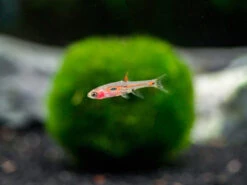 The Phoenix Rasbora (Boraras merah) is a strikingly beautiful nano fish that is very popular among aquarists due to its schooling behavior, peaceful disposition, and very small size. This schooling fish can be the highlight in any peaceful community aquarium and it is a particular standout in the planted aquarium. With optimal diet and care, many males of this species display bright ruby red coloration. This species is often confused with the very similar Chili Rasbora (Boraras brigittae). In fact, there is some debate among experts as to whether the Phoenix Rasbora and the Chili Rasbora are in fact separate species or rather just geographic variants of a single species. Compared to the markings and color of the Chili Rasbora, the Phoenix Rasbora’s dark markings are typically more broken and red coloration is more limited to these areas of dark markings.