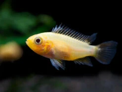 The Platinum Double Red Cockatoo Dwarf Cichlid (Apistogramma cacatuoides) is an incredible color morph of its parent species. Males are particularly colorful, boasting incredible bright red-orange coloration on the ample dorsal fin as well as the tail. Some specimens also have this coloration on the anal fin, constituting “triple red” status. The body is typically a yellow or white sheen, which is very unusual for this species. As with most dwarf cichlids, females are less colorful, but still have an attractive appearance and plenty of personality.
