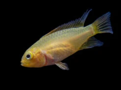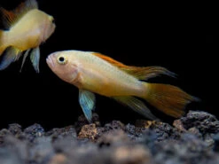 The Platinum Orange Flash Cockatoo Dwarf Cichlid (Apistogramma cacatuoides) is a variant of one of the most beautifully colored and most popular dwarf cichlids in the freshwater aquarium hobby. Males are particularly colorful, boasting incredible bright orange coloration on the ample dorsal fin as well as the tail. The body is white-gold. As with most dwarf cichlids, females are less colorful, but still have an attractive appearance and plenty of personality.