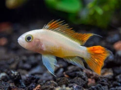 The Platinum Orange Flash Cockatoo Dwarf Cichlid is a remarkable variant that has a clean white-gold body and striking orange fins in males!