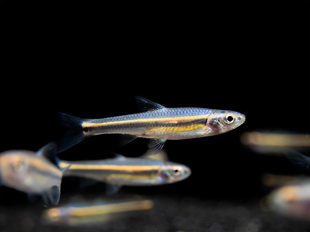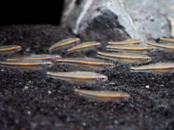 The Rainbow Shiner typically occupies the top and middle level of the water column, although it can often be seen swimming and feeding in the middle and bottom levels as well. It is safe with other peaceful, small fish and is neither bashful nor brash. Due to its extra small size and peaceful demeanor, it can be safely kept in the community aquarium, though as with most fish, it may eat some shrimp fry. Larger, peaceful invertebrates can also make good tankmates. The Rainbow Shiner must be kept in schools of 6-8 or more, although much larger schools of 10+ are more ideal. Its natural habitat typically consists of shallow, clear water and lots of vegetation. While it can tolerate tropical water conditions as long as water quality is good, the Rainbow Shiner is naturally a subtropical species that will thrive in cooler water, which makes it an ideal tankmate for many ornamental shrimp, Stiphodon and other smaller gobies, and hillstream loaches, among many other species.Â