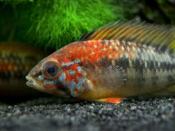 The Red Shoulder Dwarf Cichlid (Apistogramma macmasteri) is a remarkably colorful dwarf cichlid that is very distinctive in its bright red and blue facial coloration. Males are typically more colorful than females, but females are also very colorful and exceptional in coloration compared to most other female dwarf cichlids. This species is a true gem among all of the colorful Apistogramma species! The Red Shoulder Dwarf Cichlid is reportedly an excellent species to keep in groups of one male and a harem of multiple females.