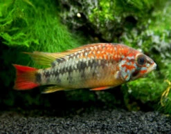 The Red Shoulder Dwarf Cichlid will thrive in an aquarium with a sandy substrate and plenty of refuge such as clay pots, driftwood, and rock formations. It is an excellent candidate for the planted aquarium, but it also needs a fair amount of open space. This cichlid is generally compatible with other peaceful fish as long as it has plenty of space. Territoriality is typically at its peak during spawning. Dwarf shrimp and other small, delicate invertebrates should not be kept with the Red Shoulder Dwarf Cichlid, but more durable, larger shrimp and snails could possibly make good tankmates in a large enough aquarium. If spawning is desired, tankmates of other species should be kept to a minimum or avoided altogether.
